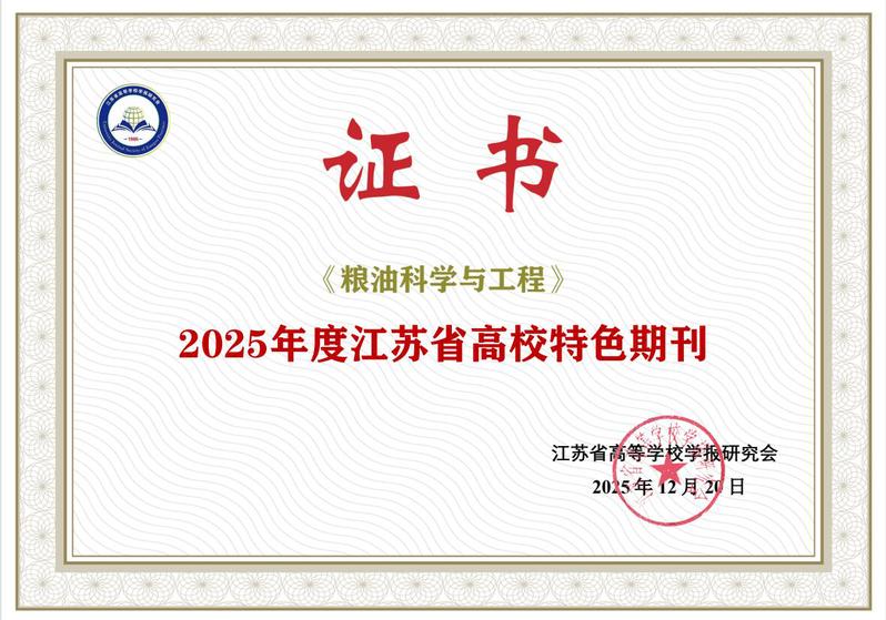 近日,江苏省高等学校学报研究会开展了新一轮高校期刊评选活动,对我省高校期刊在科学研究和学术交流中的作用及其质量进行客观、全面的评价,以树立榜样、明确方向,促进我省高校期刊健康发展。经过一系列基于客观数据和申报意向的评选程序,《粮油科学与工程》成功入选“2025年度江苏省高校特色期刊”。